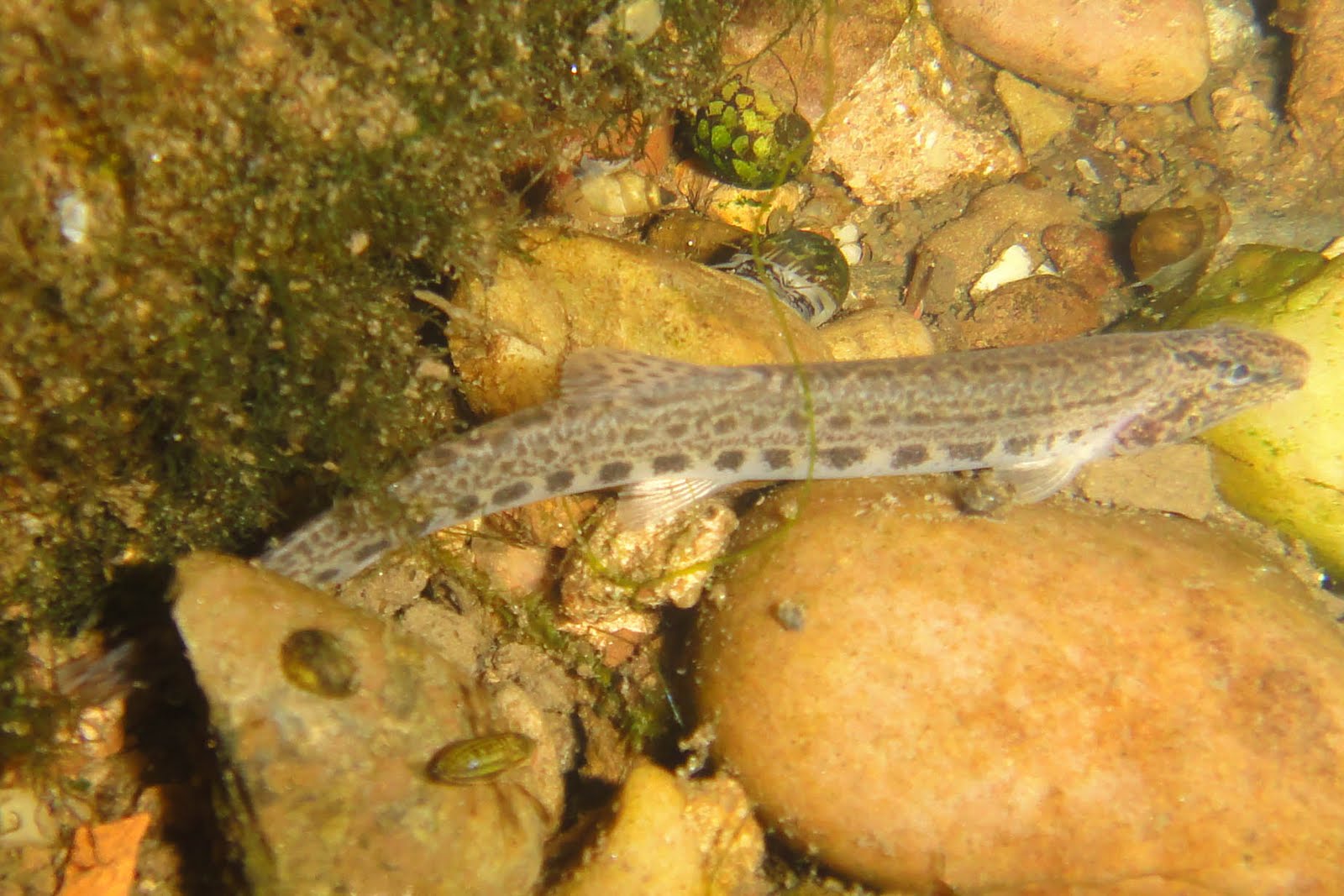 As well as long range surveillance I was also on a micro species lookout, highlight of the evening was the capture of a spined loach, albeit only via the waterproof camera... At the time I thought it was a stone loach, but a closer look at the photos, in particular the regularity of the markings on its sides makes me 90% sure its a spiny.